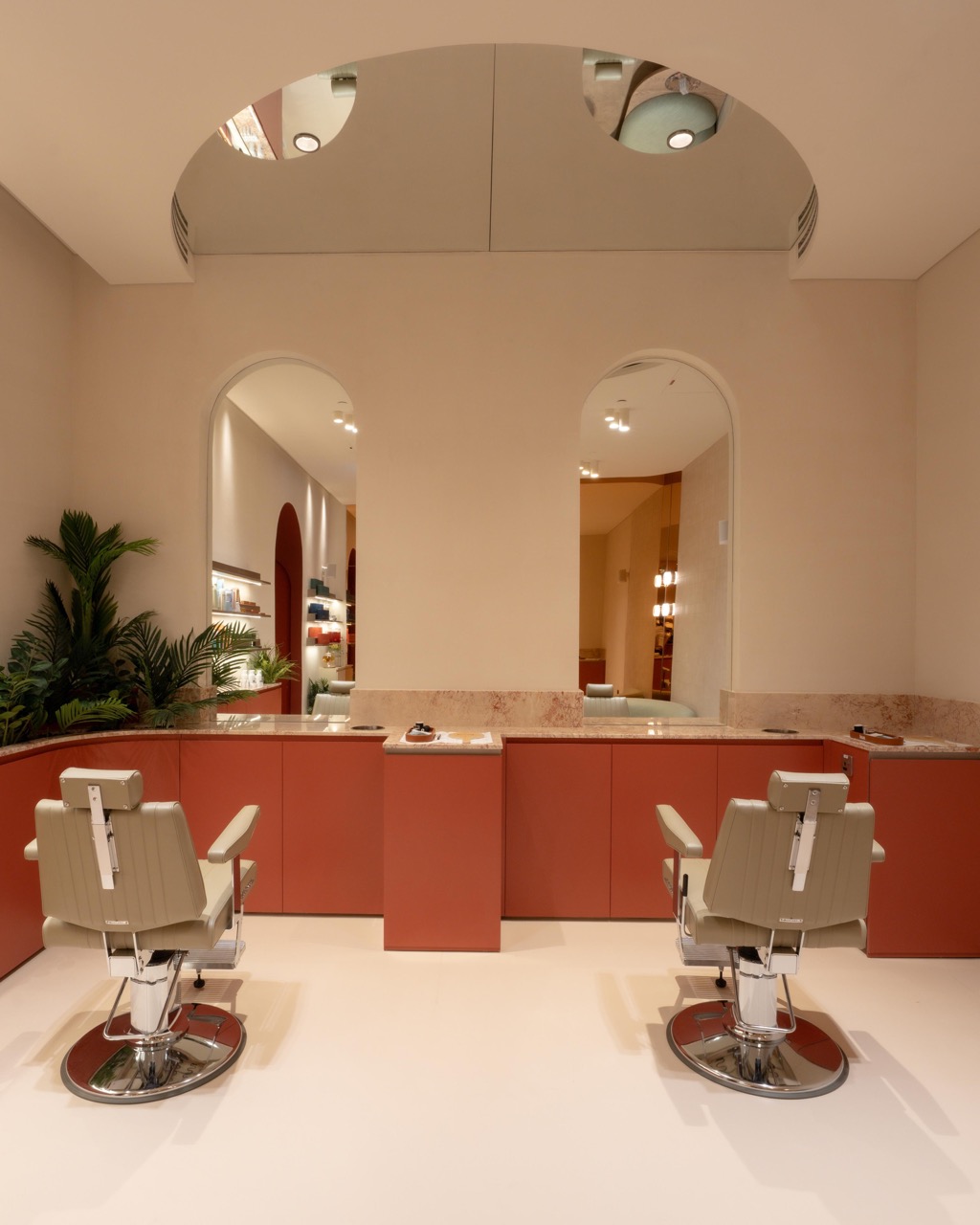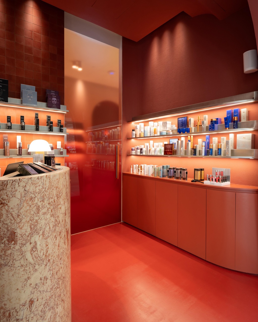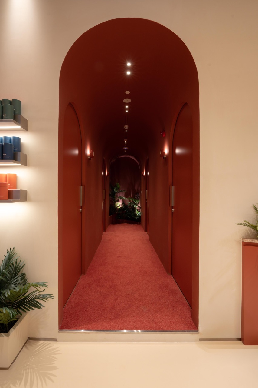 Anchored by Brau’s signature red travertine, the interior blends organic architecture with sculptural minimalism. A palette of sand beige, terracotta, and warm ivory tones evokes natural elegance, while soft, directional lighting by Bright Lumiere enhances texture and rhythm.