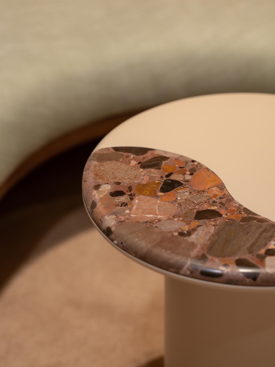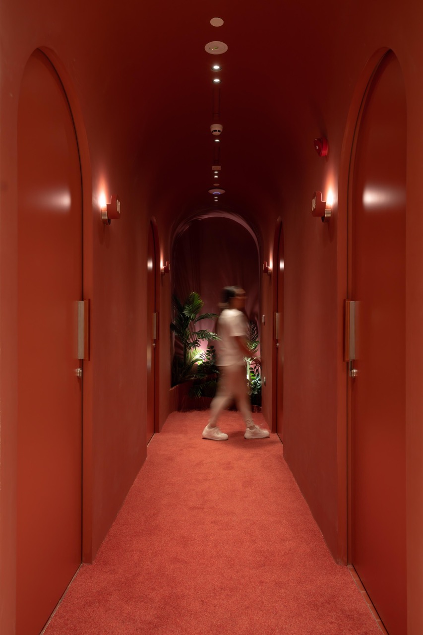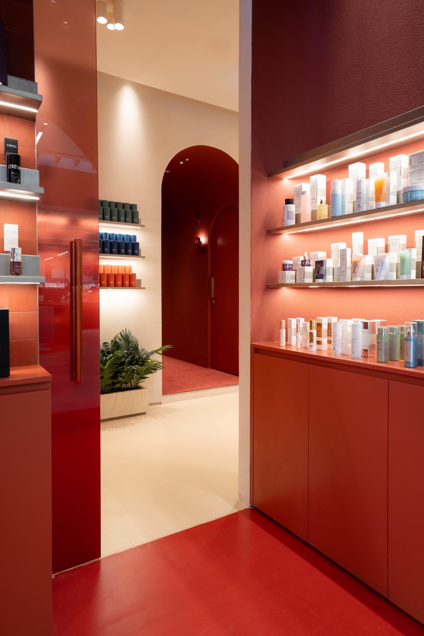 Anchored by Brau’s signature red travertine, the interior blends organic architecture with sculptural minimalism. A palette of sand beige, terracotta, and warm ivory tones evokes natural elegance, while soft, directional lighting by Bright Lumiere enhances texture and rhythm.